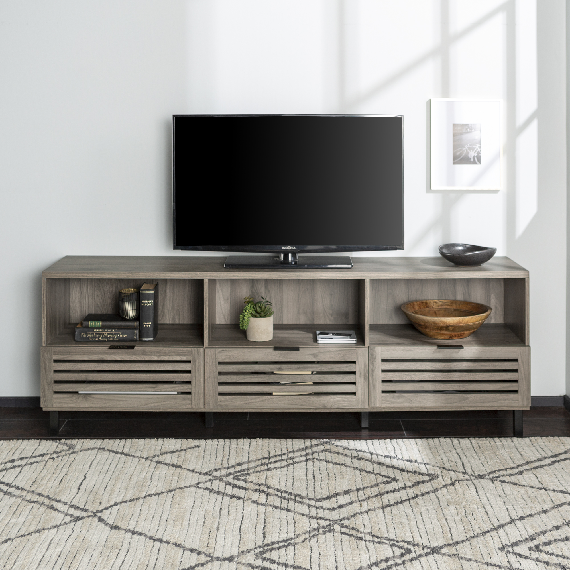 Featuring several alternatives for storing your media, this 70-inch media console will keep your items organized in your home. The long frame fits three separate compartments on top and below, with the top three being open shelves and the bottom three being side cabinets and a middle drawer. Store anything from your electronics and media to your décor and books. Perfect for your living room as an entertainment center, in your home office as a storage console, or in your bedroom as a TV stand as it can hold up to a 78-inch TV. It’s made of laminate and features metal handles on the slatted style door fronts for a mix of transitional, modern, and boho style.
