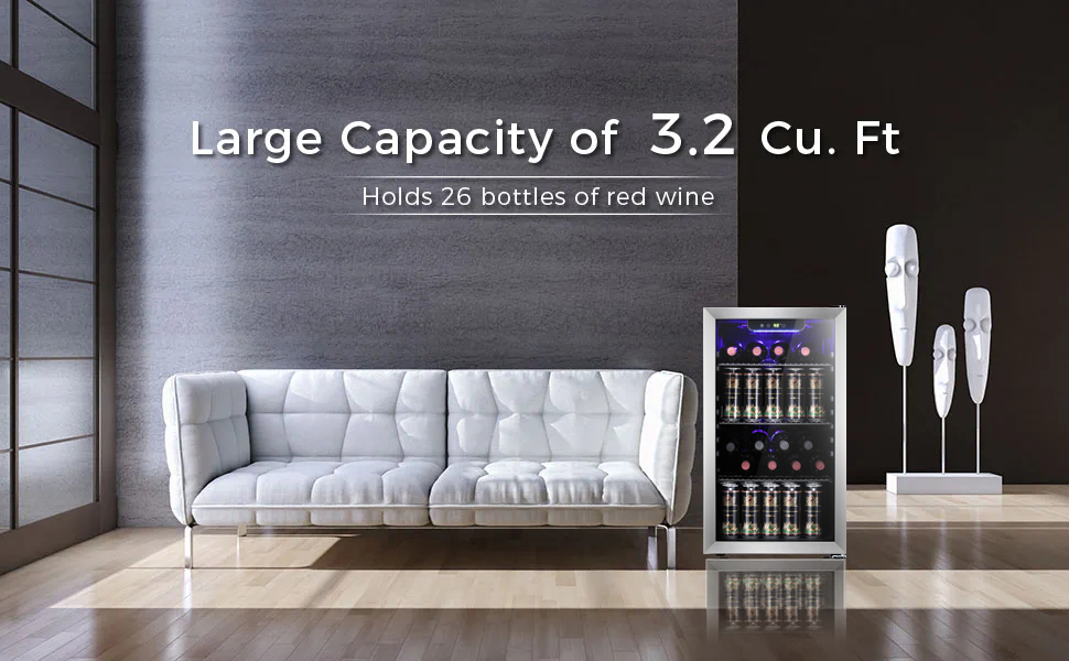 • IDEAL LIGHT and HUMIDITY: The reinforced glass door with air tight seal helps to maintain an ideal humidity level, this beverage refrigerator gives you a compact and modern sensation. Perfect for your living room. Blue soft LED interior lighting not only beautifully showcases the wine but won’t damage the wine.