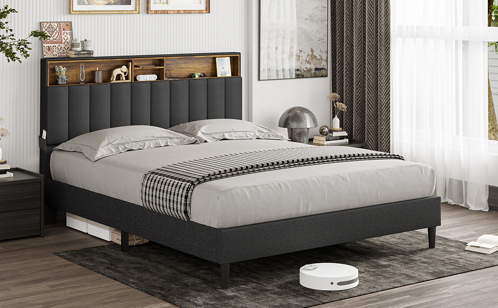 【Adjustable Height Headboard】Adjustable Height: 43.7’’-47.7’’. It can fit queen size mattress in different thickness 10’’--14’’. This modern platform bed frame with power strip and storage headboard upholstered in high-quality linen fabric, soft to the touch, and the storage headboard is expertly constructed with dense foam padding for the night after night of restful sleep.